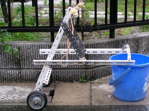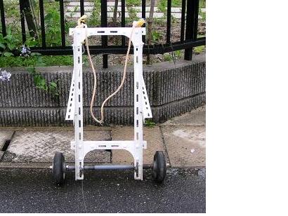 今は直径12cmの車輪を使っていますが、15cm程度のものが良いと思います。当初は自転車の補助輪を使用していましたがプラスチック製のため騒音がひどくゴム製タイヤ(キャスター用)に交換しました。