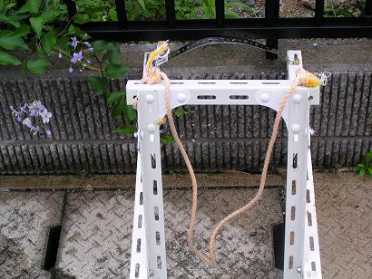 縦枠の上棒にレオの後ろ足を吊り下げます。また、跳ね上がり防止のため肩あてからタオルをまわし首下で結びます。