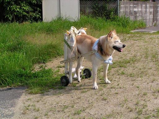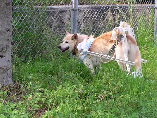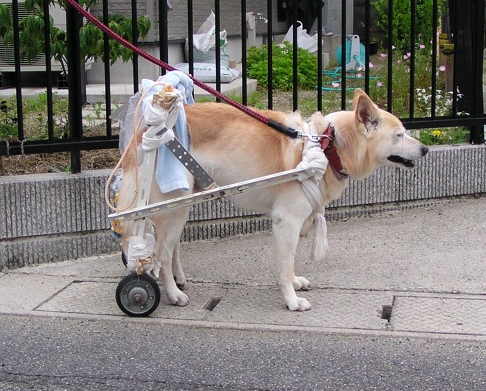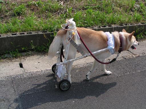 昨年10月に突然下半身不随になりました。最初はタオルを割いたもので後ろ足をささえ散歩にいっていましたが、重たいため長時間の散歩は無理でした。プラスチック製のかごに車輪、柄をつけた「乳母車」(下半身のみを入れる)などを試していたのですが、油断すると体がぬけ落ちることや大小便の始末がうまくいきませんでした。よい方法がないかとインターネットで検索したところ、hiroさんのHPにいきあたり参考にさせていただきました。ありがとうございます。