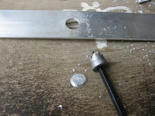 ベアリングを使用する場合、車軸の太さより少し大きい穴を開ける必要がありますが、今回は16mm径の穴を開けられるホールカッター(右下の工具)を使用しました。 簡単に、綺麗な穴が開けられます |