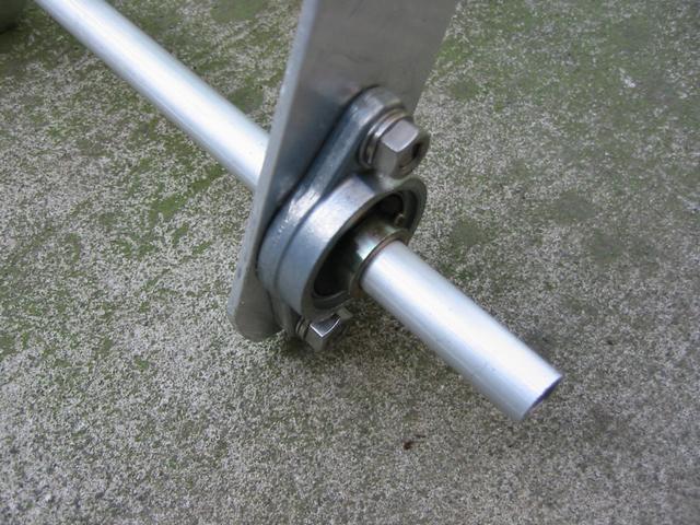 フランジ付きベアリングに、車輪の穴に合わせて12mm径のアルミパイプを車軸に使用しました。 |