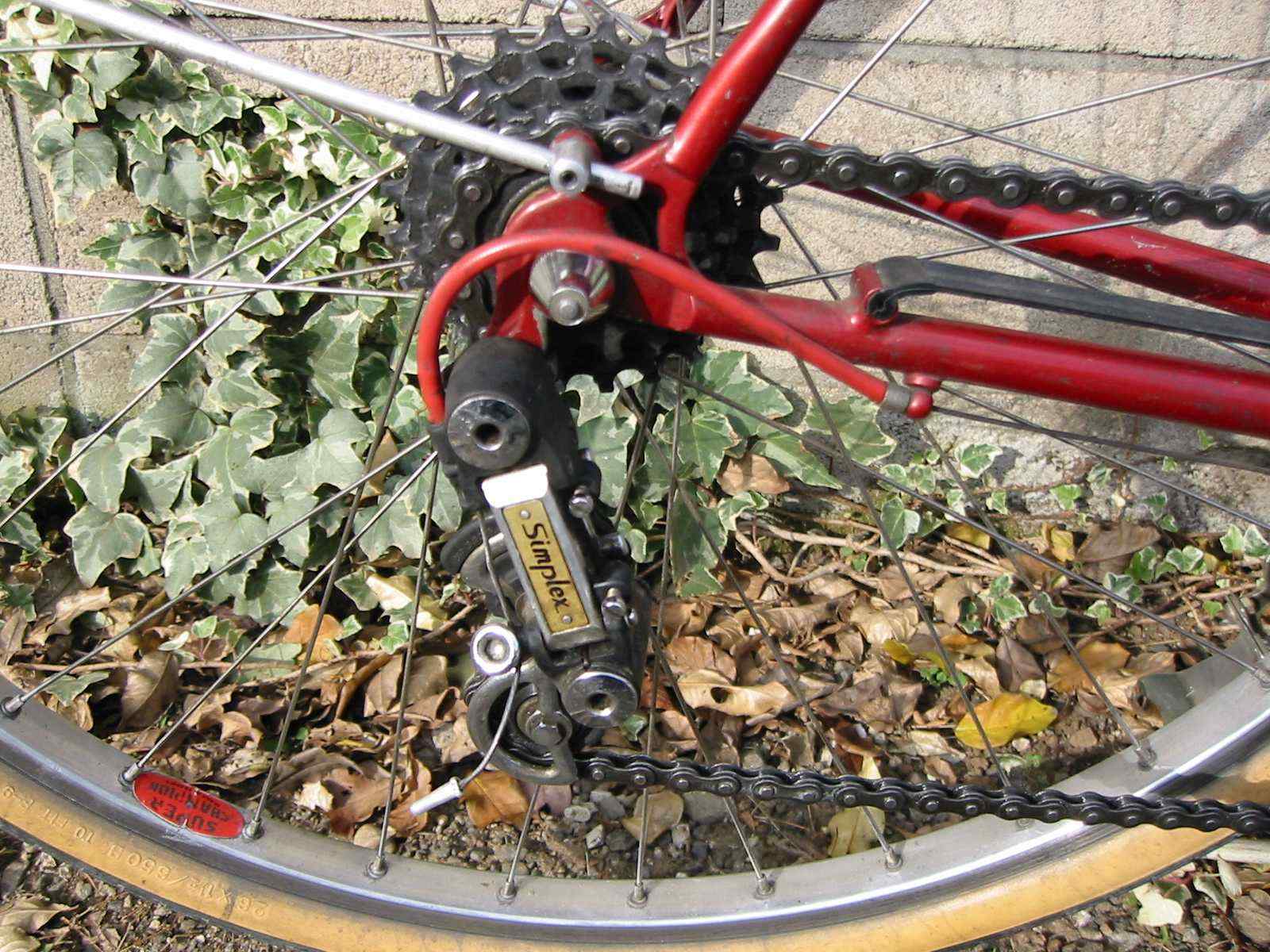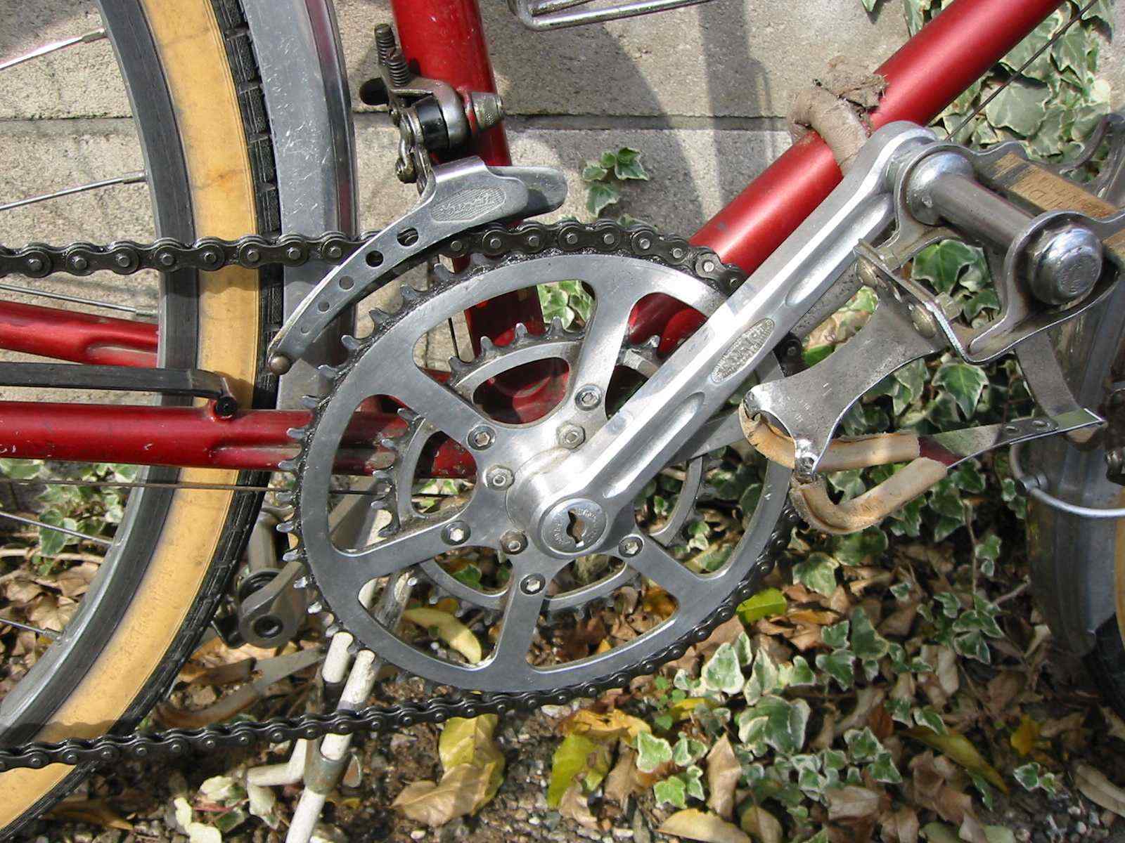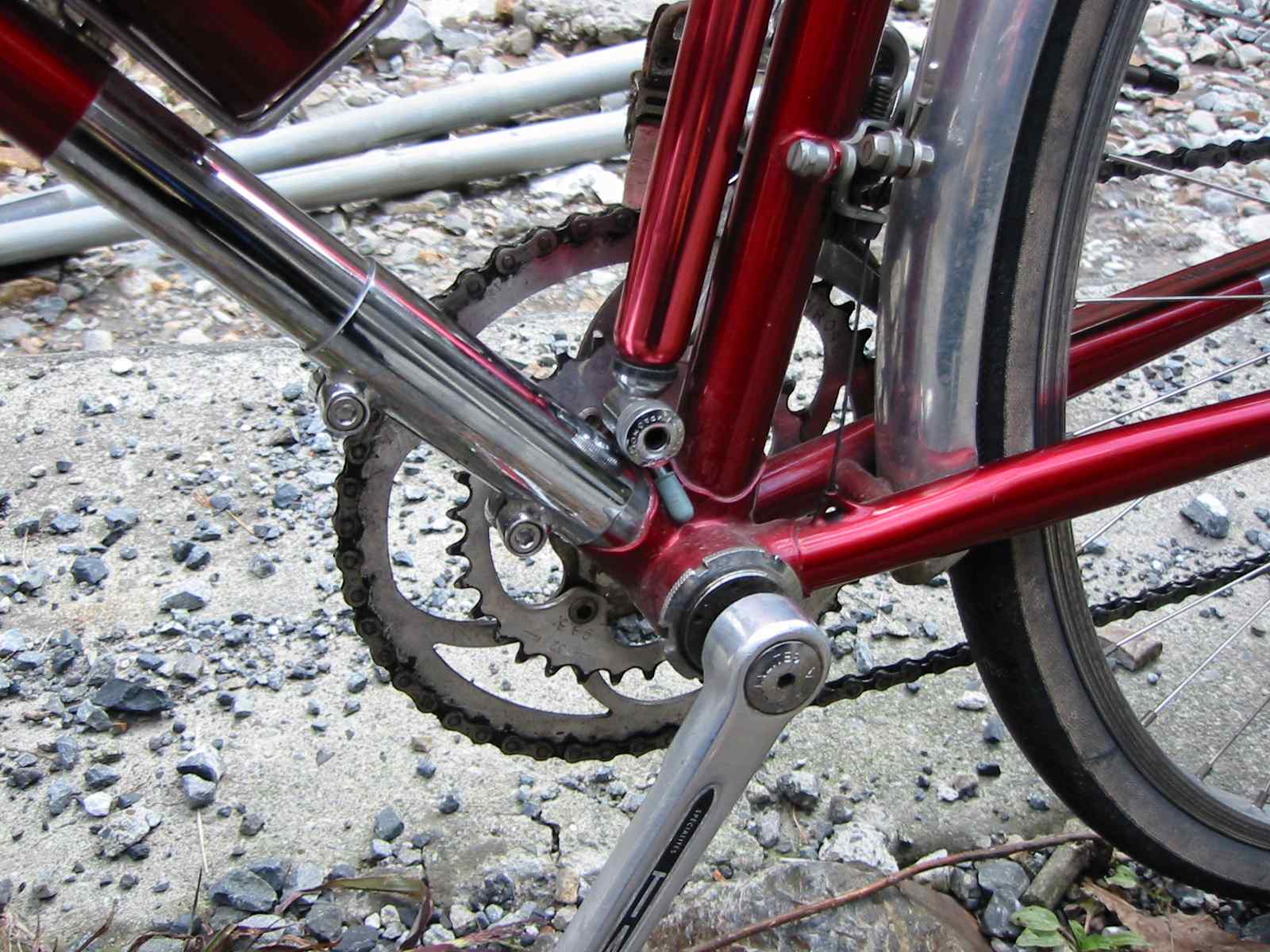 ランドナーの定番ストロングライトのクランクに、TAのチェーンリングとレオタードプラッフォームペダル・サンプレックスプレステイジリアディレイラー・フロントディレイラーはユーレー直付・リムはスーパーチャンピオンの組み合わせ |