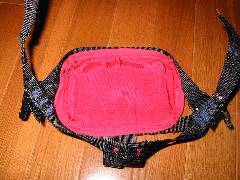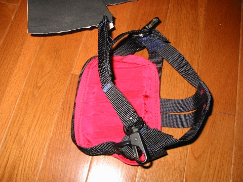胴輪型ハーネスの赤いナイロンの部分には、キャンちゃんの体重を分散させるため、写真の上に写っている10mm厚のウレタンスポンジを入れてあります。ベルトの長さはバックルで調節できます。 |