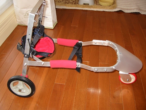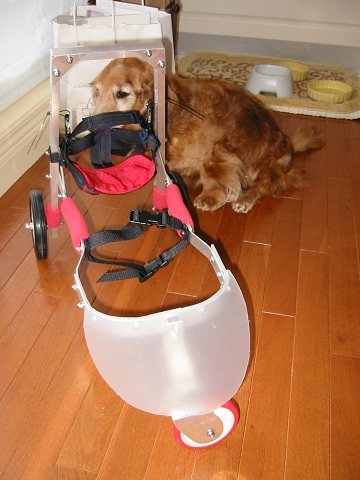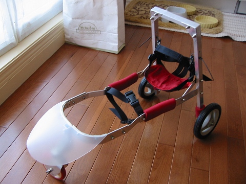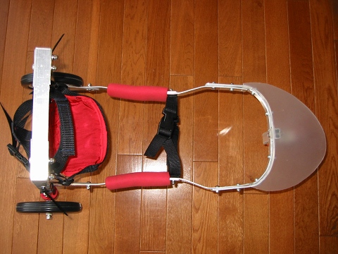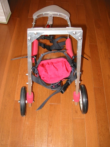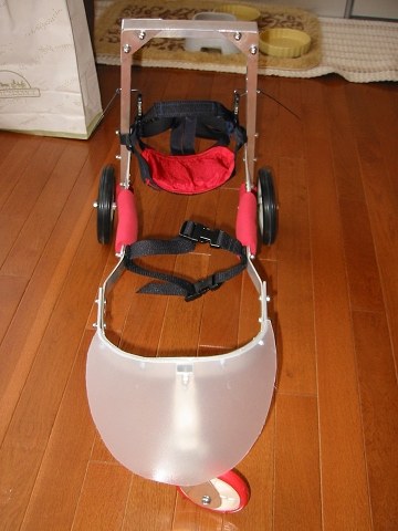 歩行器を前から見たところです。胴輪型のハーネスを改良しました。 |