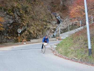 途中、旧道を走るが、Okano氏がパンク