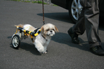 ・腰をタオルなどで吊って持ち上げた状態で、前足で体重を支えて歩くことができれば、車いすで散歩をさせてあげることができます。(前足に身体を支えることができる力が必要です)