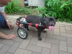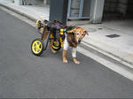 最初は車椅子のフレームの前端をリードなどで少し持ち上げて補助してあげるか、車椅子のフレームの後ろの部分を押してあげるなど歩行補助してあげてください。
