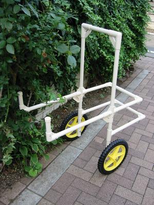 ・私にとっては初めての大型犬用車椅子作りでしたが、フレームにイレクターというパイプ材料を使用して製作したところ、加工が簡単で強度も確保でき、意外とうまく行きましたのでご紹介します。