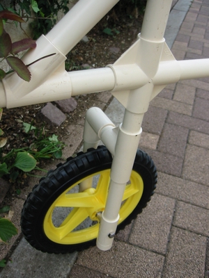 前の写真では、車輪の取付け部の強度に不安があったのでイレクターパイプで補強することにしました。 |