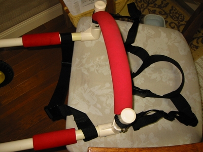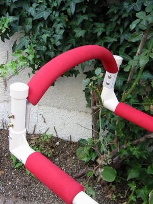 赤い部分は、体の保護のためのウレタンパイプです。肩にあたるアーチ部分は芯にアルミの板材が入っています。 |