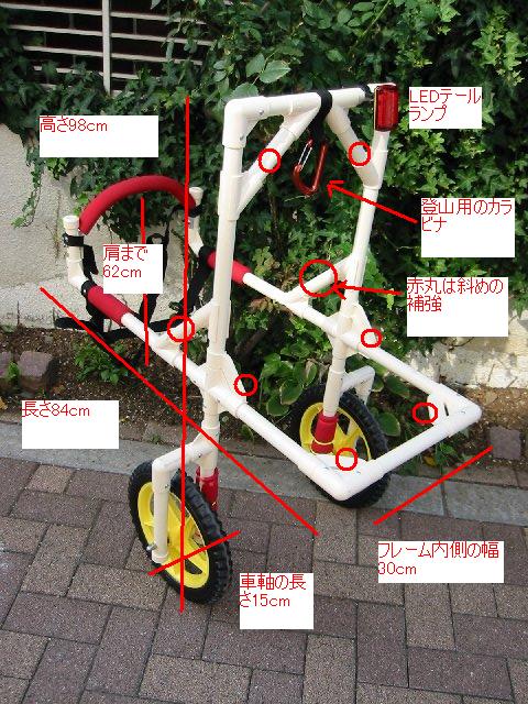 イブちゃんの車椅子のサイズです。上のサイズ+パイプの太さが全体サイズになります。 |