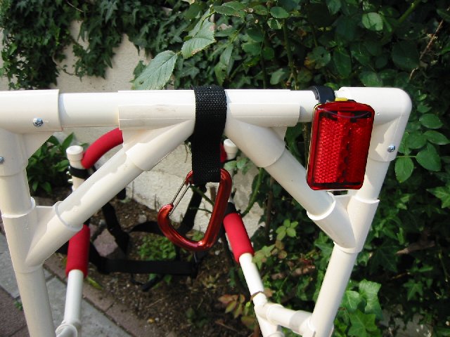 夜の散歩の安全のため、点灯・点滅切り替え式のテールランプを取付け、ハーネス吊り下げようのカラビナも取付けました。 |