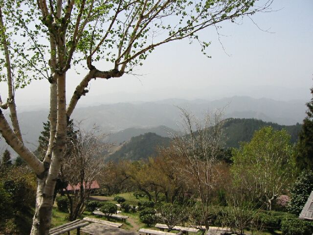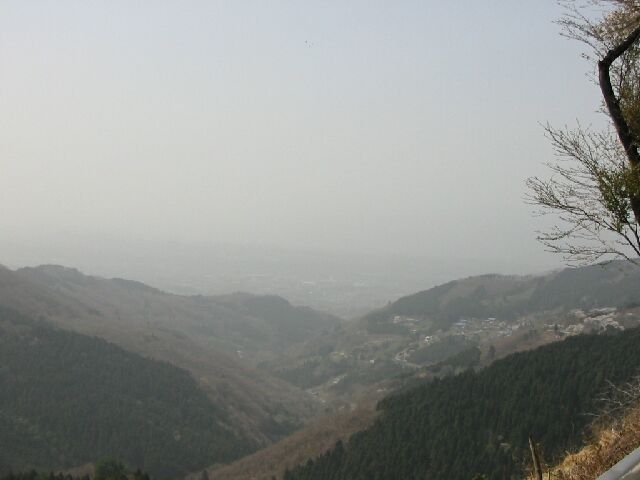 春霞でぼけているが、刈場坂峠からの展望