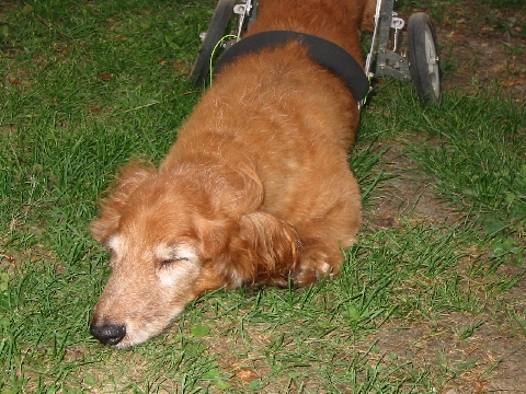 散歩の後は、気持ちよさそうに庭の木陰で涼んでいます。 |