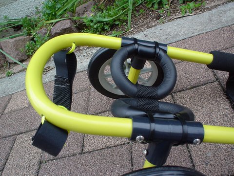 車椅子は、プラスチックフレームに黄色のカッティングシートを貼って仕上げてあります。フレームに巻きついている黒い部分も、発泡ゴム素材です。 |