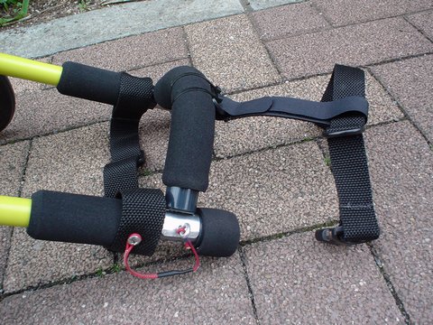 首輪型ハーネスは、背当てと連結するようにしました。長さ調節はマジックファスナーです。肩当は、赤い紐のついたアルミのピンを抜いて行います |