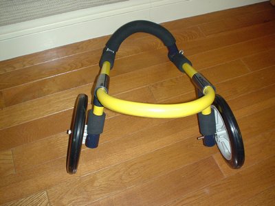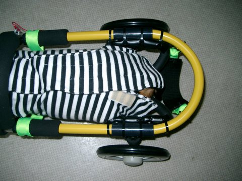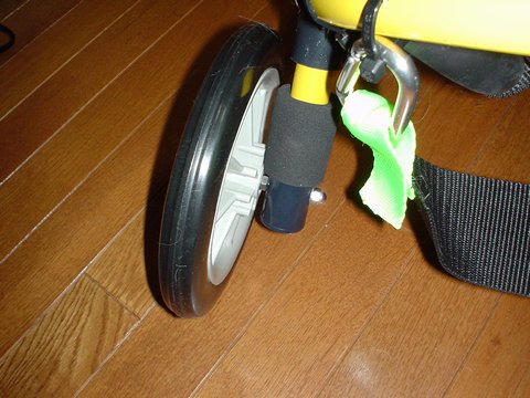 レッグサポートと胸ベルトを取り付けたところで、アドに試乗してもらいました(アドにはちょっと小さいようです) |