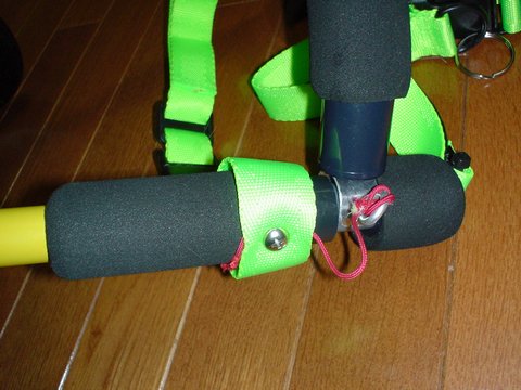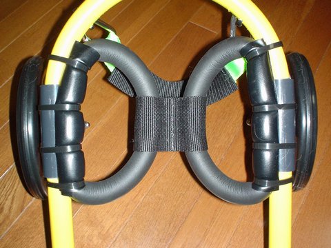 後ろ足を支えるレッグサポートは直径20mmの柔らかい発泡ゴムで、ウエットスーツ生地の芯と同じ素材です。 |