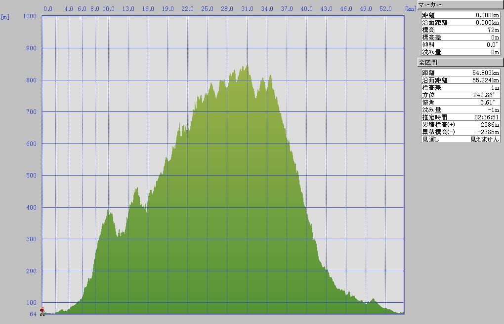 つつじ山公園駐車場発(9:30)→鎌北湖9:55(走行距離8km・実走行時間21分)→顔振峠10:53(走行距離19.9km・実走行時間1:12・平均時速16.4km)→刈場坂峠12:05(全走行距離30.8km・平均時速15.3km・実走行時間2:00)→つつじ山公園駐車場13:50(全走行距離54.7km・平均時速18.4km・実走行時間2時間58分・最高速度46.8km)
