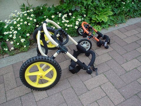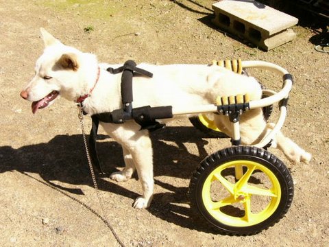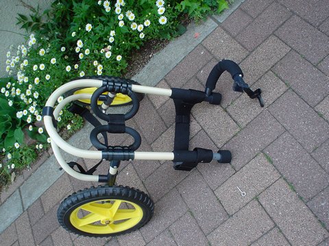 修正後の車椅子は、ぴったりサイズだったようです。かなちゃんは、下り坂も前足でブレーキをかけながら、上手に下って行くそうです。 |