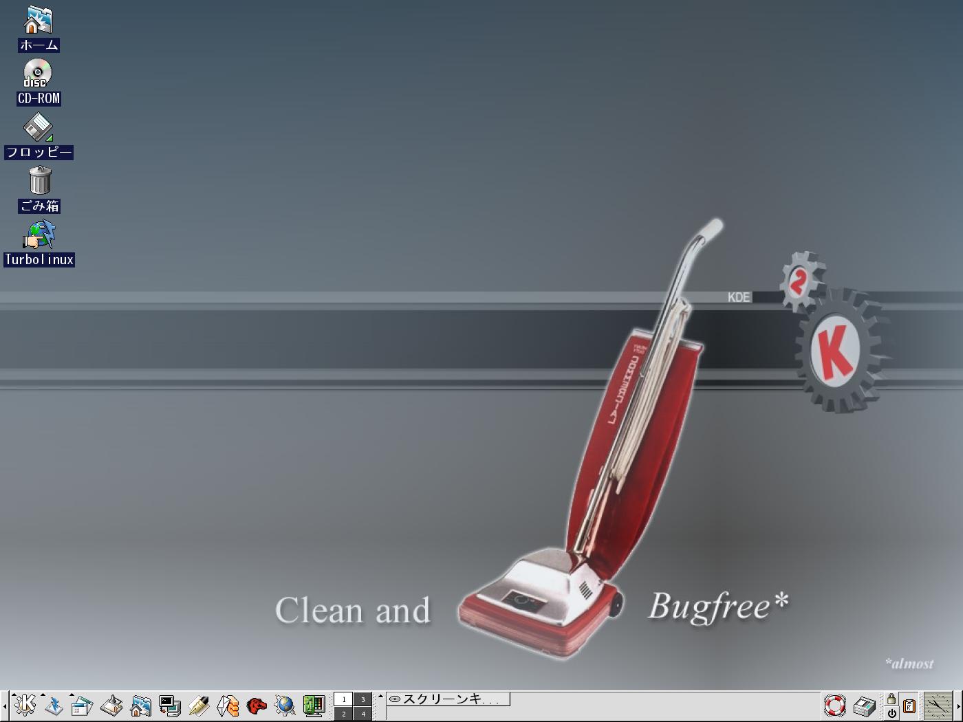 Linuxと言えば、コマンドラインに直接入力して使用もできるのですが、私はまだ勉強不足でよく分からないので、今のところWindowsと似たGUIで使用しています。(下の画像Turbolinux7のデスクトップのキャプチャーです)今日一日しか使用していませんが、感想としては、独特の操作もあるようですが、WindowsとMacの両方に似ている気がします。