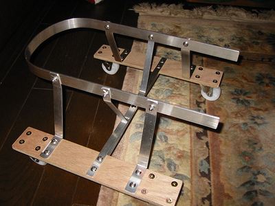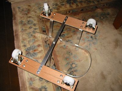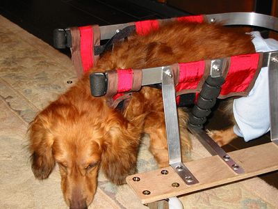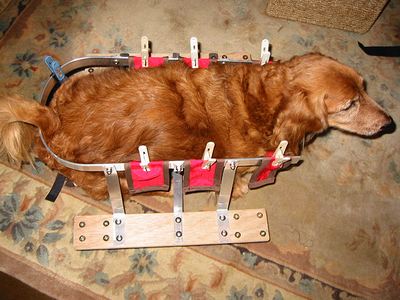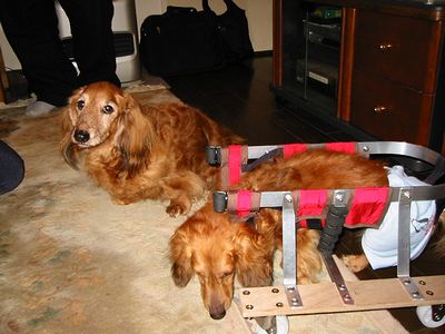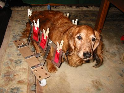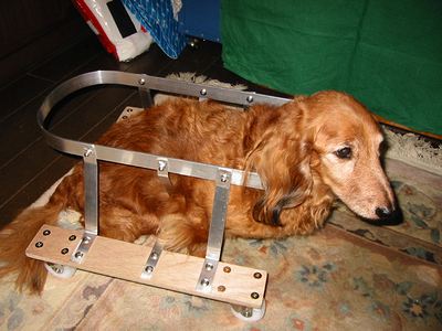 最初は、スケートボードの様な歩行器具で体を支えたら良いのではないかと思い、試作品も作りましたが、どうもうまく行きそうもないので、 アイデアを捜すため、外国の犬の車椅子のホームページDogo'n Wheels→