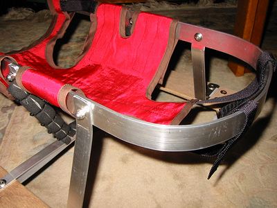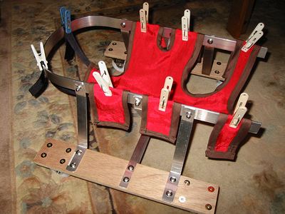 マジックテープで、ハーネスをフレームに取り付ける方式です 茶色の縁取りテープを回りに縫いつけてあります |