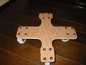 最初のスケボー形式の試作品がこれです。合板にキャスターを付けました。 |
