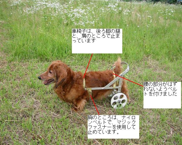 車椅子装着後の後ろからの写真ですが、腿で体重を支え、後ろ脚が下に着かないようベルトと紐で吊り下げています。
