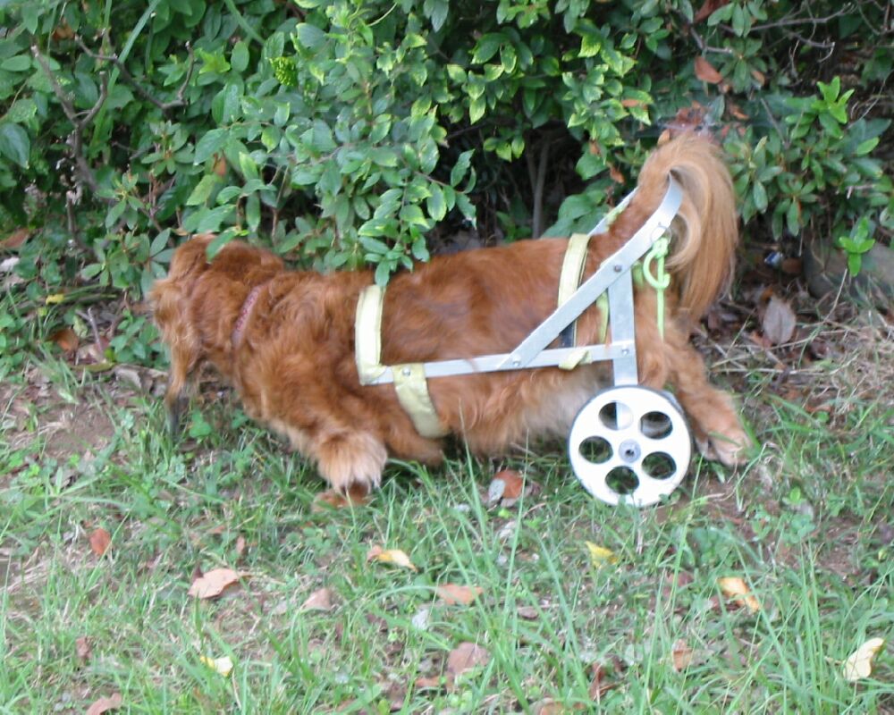 アドは、下半身麻痺となった時から現在まで、約6年間、後ろ足で立つこともできず、家の中では、前足だけで這い回る生活をしていますが、当初は、散歩に連れて行くのに、タオルや帯状のひもを腹の下に回し、後ろ足を吊り上げて歩かせていました。