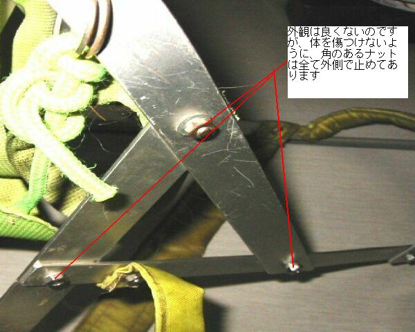 基本構造は、アルミ材を金ノコでカット・ヤスリ掛けして整形した後にドリルで穴を開けてのビス止め方式ですが、ステンレスビス・ナットを使用しているため、サビも出ていません。また、スプリングワッシャを使用しているため、心配していたネジの緩みも殆ど皆無です。