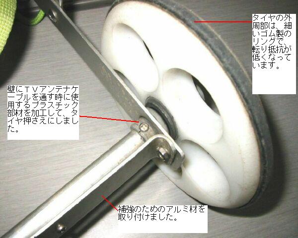 車輪の取り付けに一番苦労しました。以前は違う方法でタイヤを止めていましたが、ガタが出て車軸が磨耗しやすいため、現在はプラスチック部材で、タイヤを挟み込む方式に変更してあります。出来るならベアリングも付けたいのですが、適当なベアリングがなく、諦めています。