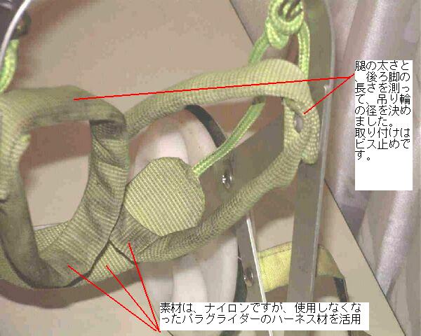 長年の使用で、ナイロン部分が汚れていますが、実は、パラグライダーで使用していた古いハーネスを解体して、ナイロンベルトや布を流用してあります。