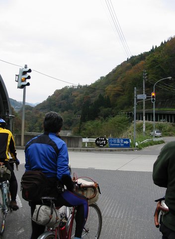 雨に降られることなく小谷温泉の入り口に到着。これから先は10kmくらい登りが続く。 |