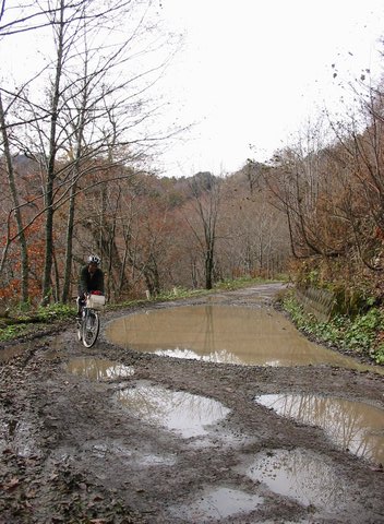 峠からの下りもジャリ道が続く。 |