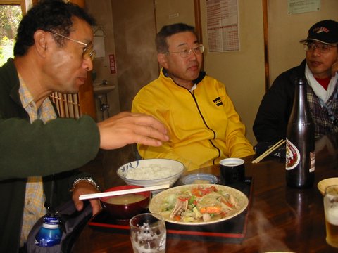 雨飾荘の夕食風景。走ったあとはビールがうまい。 |