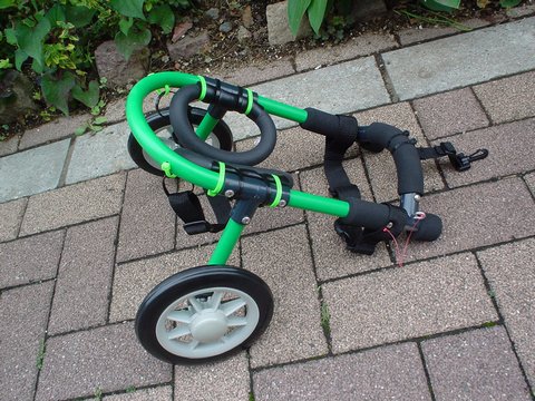 散歩は大好きで、私の作った介護ひもを付けて、後ろ足をつると前足で、元気よく歩いています。保護したときは、若く見えましたが、10歳は過ぎているようです。外が大好きなので、自由に歩くことができる車椅子を作ってもらいたいのです。よろしくお願い致します。