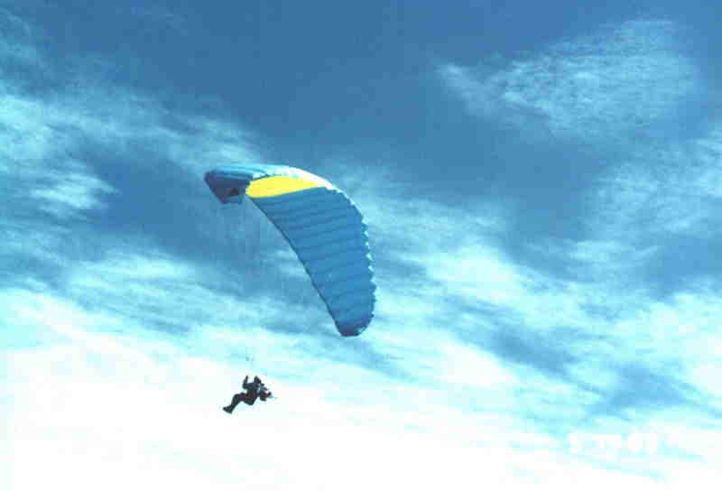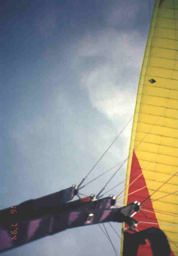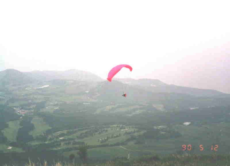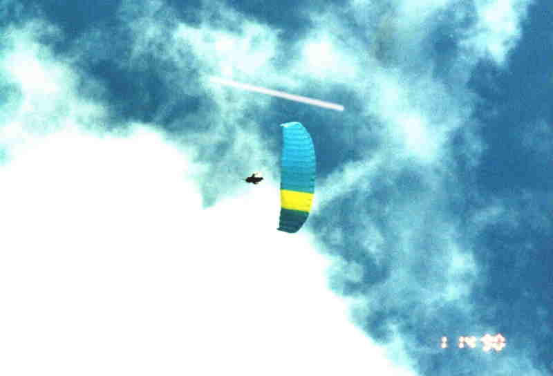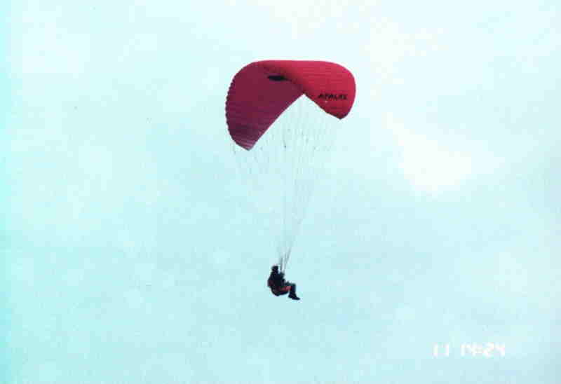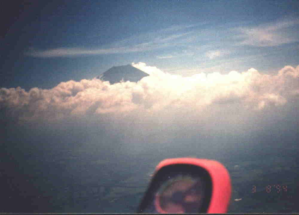 1994.8.3 朝霧高原 第一興商エリアにて テイクオフ後調子に乗って旋回ながらサーマルを捕らえていたところ、低い雲に入ってしまい、あわてて雲の前方に逃げた。