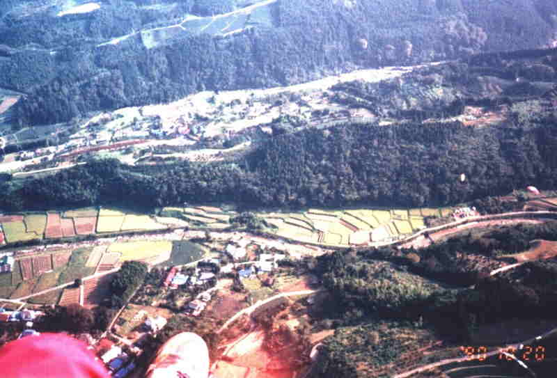 1990.10.20 足柄のヤグラ岳にて撮影 前方の川を渡った先の休耕田の一部がランデング場所です。