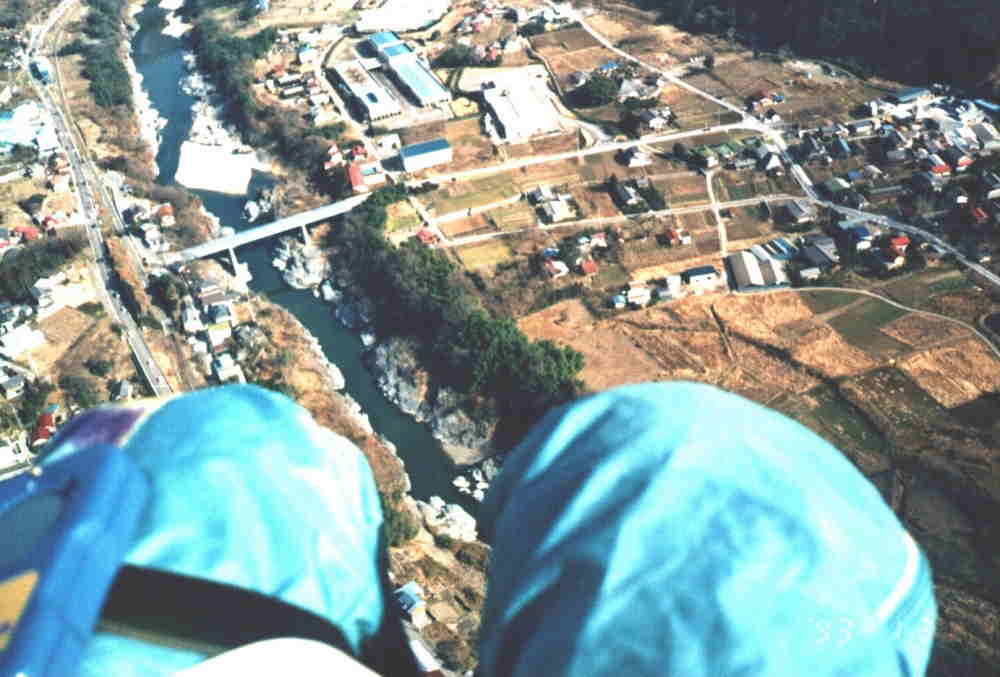 1994.9.2 埼玉立山パラポートにて 真下の長瀞川を越え右側の空き地にランディングしようとしているところ
