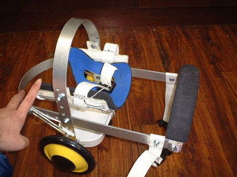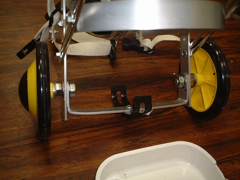 Kさんの製作したププちゃんの車椅子は、体を支えるハーネスや足乗せ台、車輪の取り付けなどKさんが独自の工夫をされています。