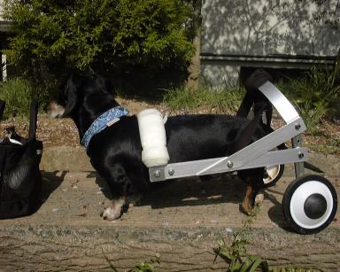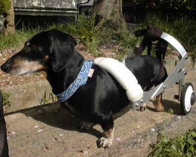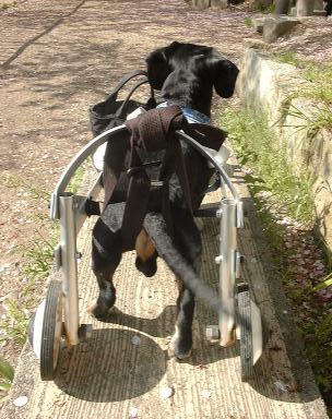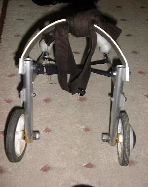 これが、2度の手術にも耐えて頑張っているシンバちゃんです。 後ろ脚に刺激を与えるために足が地面に着いてます。 |