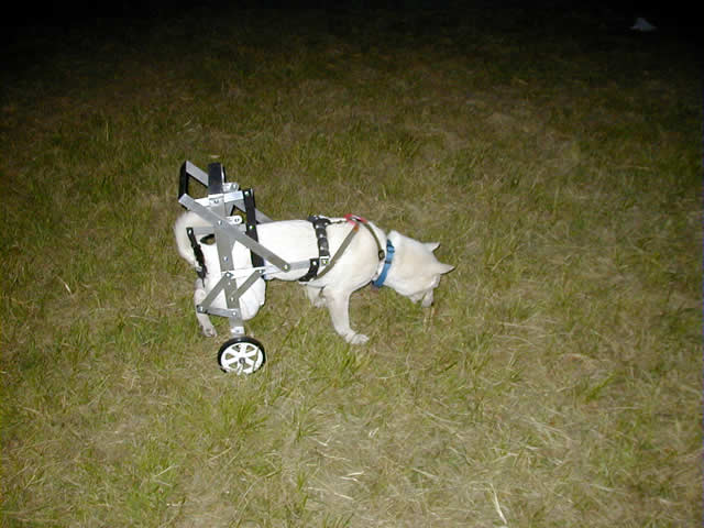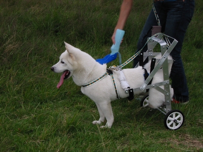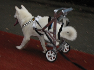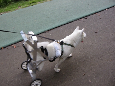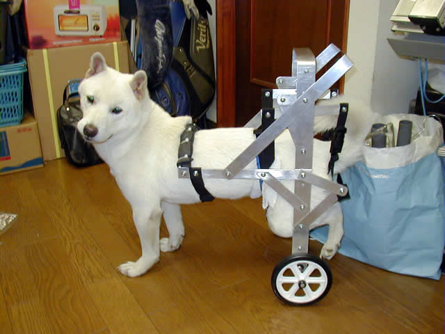 シロは前足が非常に強く、後ろ脚を浮かしぎみにして、前足だけで歩くことができるほどでしたが、後ろ脚を伸ばすことができないので、車椅子に下半身を吊る方法を工夫する必要がありました。