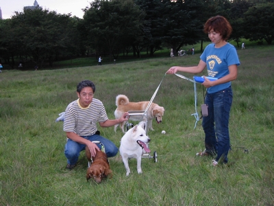 その後、何回かメールの交換を行い、6月にはシロを連れてカップルで我が家に来ていただき、車椅子の製作方法と部品の調達について話をしました。(Yarimituさんにも協力していただき、公園でラムの車椅子も見せて貰いました。)