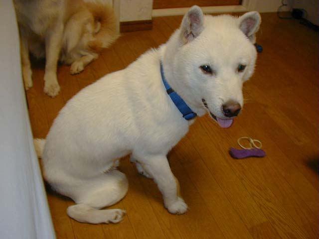 シロの写真です。可愛く撮れていますが、頭が大きくて、まだ子犬の体型ですね。 |