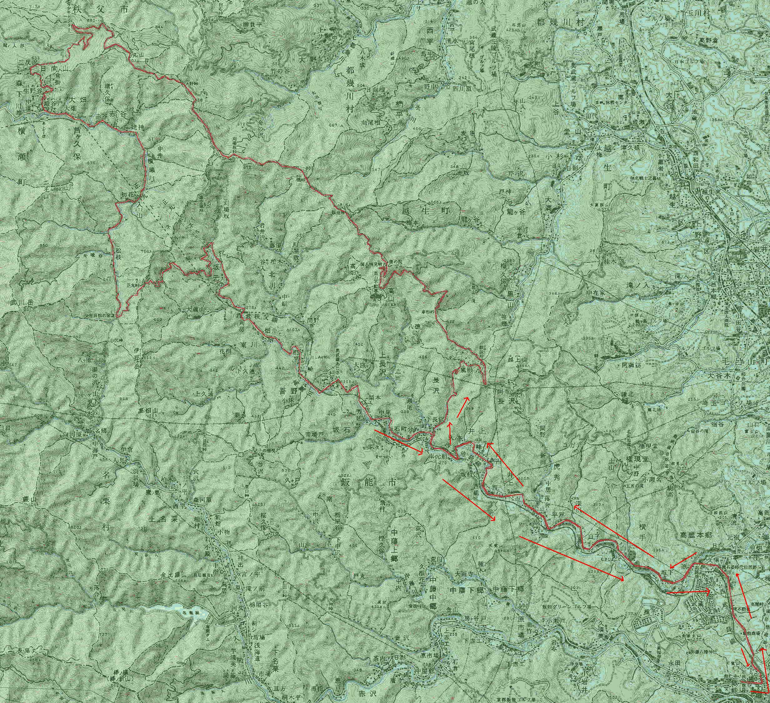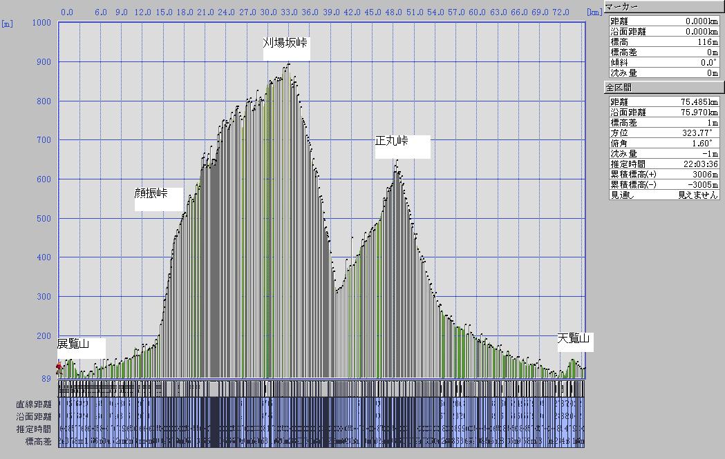 展覧山から、奥武蔵グリーンライン、正丸峠を経由して、再び展覧山へ戻る周回コースの標高データです。(カシミール3Dを使用して作図)